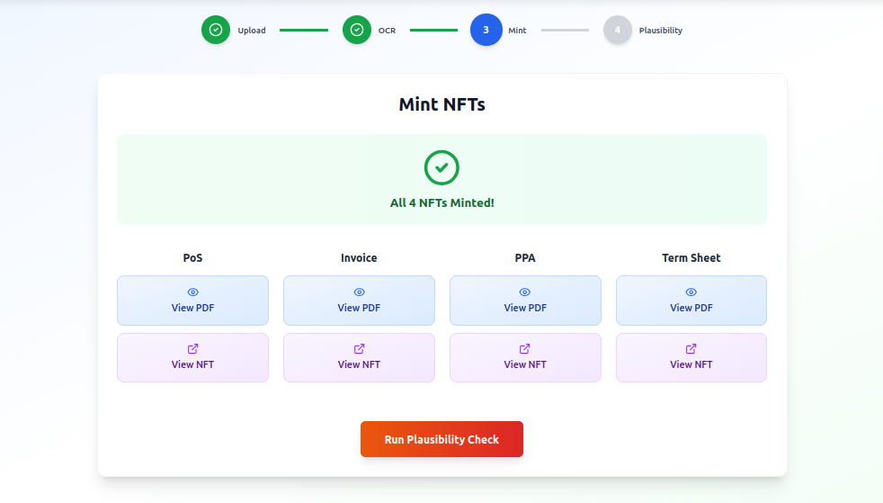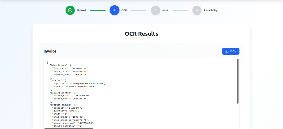 The OCR step extracts key data fields from Proof of Sustainability (PoS), invoices, PPAs, and term sheets. It transforms unstructured PDFs into structured, verifiable data.